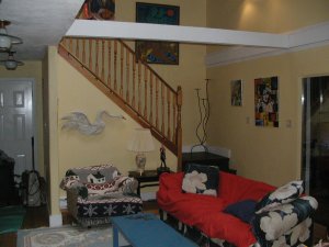 living room, viewed from the kitchen. The sunroom opens to the right,