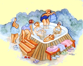 After using a squeegee to get rid the puddle of "H2O" under my bum, I slathered up my Rabbit with good ole LS and got to work in earnest (actually in Ladyfish). Carefully sliding it in, I was surprised once again at the size. I eased it in and out a few times to get used to the size of it, then started with the simple vibrate mode. It was pretty damn good. All my sensitive parts perked up and I found myself wishing I had a tongue, possibly attatched to a man (possibly a Tall Guy with a ponytail), to rub all over my body. From there I decided to see what else it could do for me, particularly with the rotating pearl beads, and that's where I got into trouble.